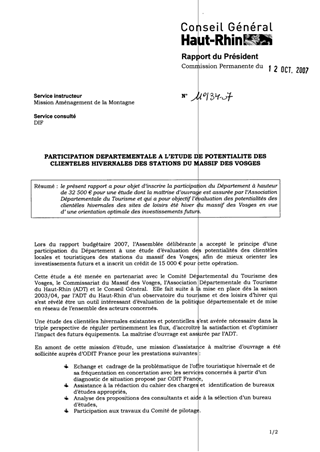 le présent rapport a pour objet d’inscrire la participation du Département à hauteur de 32 500 € pour une étude dont la maîtrise d’ouvrage est assurée par l’Association Départementale du Tourisme et qui a pour objectif l’évaluation des potentialités des clientèles hivernales des sites de loisirs été hiver du massif des Vosges en vue d’ une orientation optimale des investissements futurs.