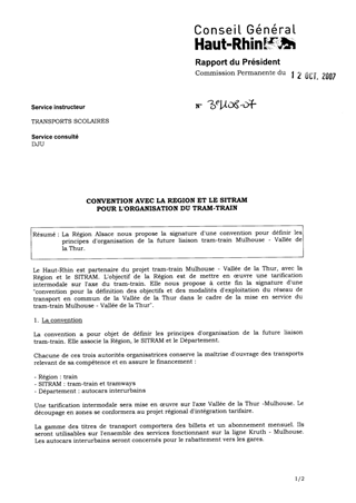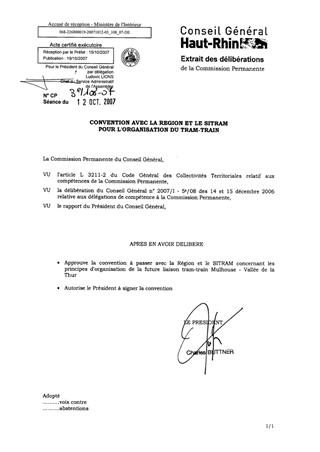 La Région Alsace nous propose la signature d'une convention pour définir les principes d'organisation de la future liaison tram-train Mulhouse - Vallée de la Thur.