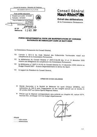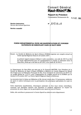 La Société de Médecine du Sport d'Alsace (SOMSA) organise son congrés annuel au Centre Sportif Régional Alsace le 20 octobre 2007. Le présent rapport propose d'allouer à cette association, une aide de 300 € au titre du Fonds départemental pour les manifestations et congrès se déroulant dans le Haut-Rhin, fonds qui a été doté au BP 2007, d'un crédit de 38 000 €.