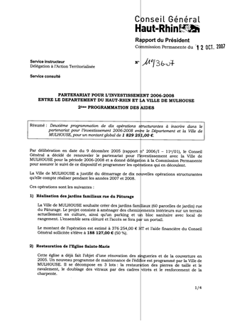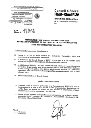 Partenariat pour l'investissement 2006-2008 entre le Département du Haut-Rhin et la ville de Mulhouse. 2ème programmation des aides