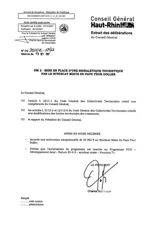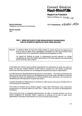 Le Syndicat Mixte du Pays Thur Doller sollicite le soutien financier du Département pour la mise en place d’une signalétique touristique sur des sites d’intérêt local, complémentaire de la signalisation départementale déployée en 2006. Au regard de l’intérêt du projet, le Département pourrait apporter un soutien exceptionnel au Pays Thur Doller représentant 50 % d’une dépense subventionnable de 50 167 € HT, soit 25 083 €.