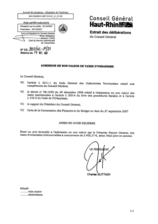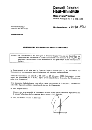 Le Département a été saisi par le Trésorier Payeur Général du Haut-Rhin sur l’admission en non valeur de taxes d’urbanisme d’un montant de 2 405,17 € qui s’avèrent irrécouvrables. Cette admission ne fait pas l’objet d’une inscription au budget.