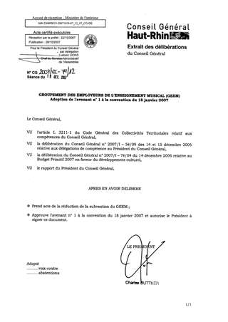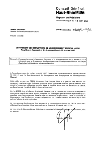 Il vous est proposé d'approuver l'avenant n° 1 à la convention du 18 janvier 2007 à intervenir avec le Groupement des Employeurs de l'Enseignement Musical (GEEM) et d'autoriser le Président à signer ce document.