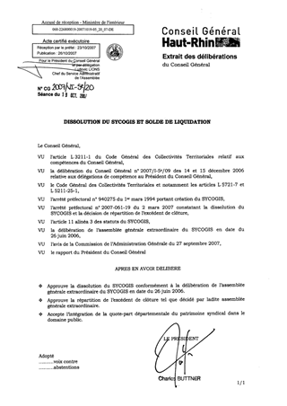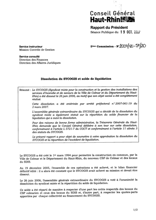 Le SYCOGIS (Syndicat mixte pour la construction et la gestion des installations des services d’incendie et de secours de la Ville de Colmar et du Département du Haut-Rhin) a été dissout le 26 juin 2006, au motif que son objet social a été complètement réalisé. Cette dissolution a été entérinée par arrêté préfectoral n° 2007-061-19 du 2 mars 2007. L’assemblée générale extraordinaire du SYCOGIS qui a décidé de la dissolution du syndicat mixte a également statué sur la répartition du solde financier de la liquidation qui a suivi la dissolution. Pour des raisons de bonne forme administrative, la Trésorerie Générale du Haut-Rhin demande que le Conseil Général délibère à son tour sur cette dissolution, conformément à l’article L 5721-7 du CGCT et conformément à l’article 11 alinéa 3 des statuts du SYCOGIS. Le présent rapport a pour objet de soumettre à votre approbation la dissolution du SYCOGIS et la répartition de l’excédent de liquidation.