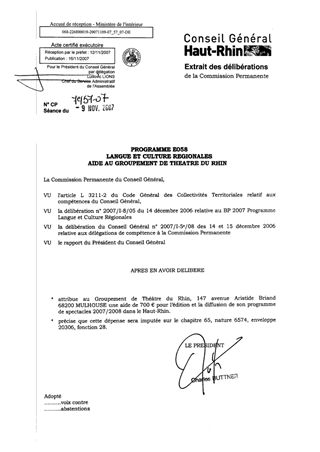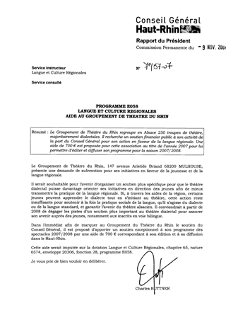 Le Groupement de Théâtre du Rhin regroupe en Alsace 250 troupes de théâtre, majoritairement dialectales. Il recherche un soutien financier public à son activité de la part du Conseil Général pour son action en faveur de la langue régionale. Une aide de 700 € est proposée pour cette association au titre de l’année 2007 pour lui permettre d’éditer et diffuser son programme pour la saison 2007/2008.