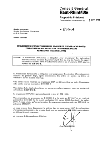 La Commission Permanente a délégation pour programmer les subventions d’investissements scolaires du premier degré, tout au long de l’année. Ce rapport concerne une sixième série de subventions relatives au programme 2007, pour un montant de 329 342 €.