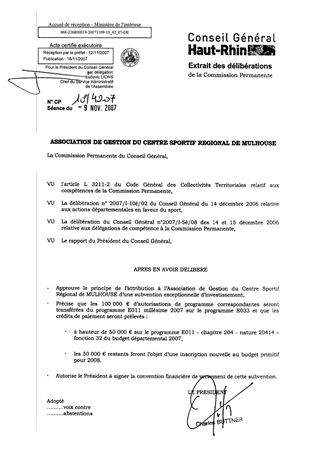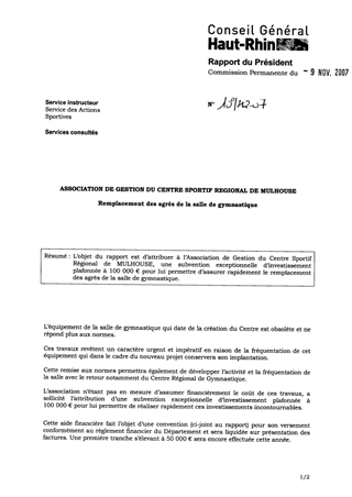 L’objet du rapport est d’attribuer à l’Association de Gestion du Centre Sportif Régional de MULHOUSE, une subvention exceptionnelle d’investissement plafonnée à 100 000 € pour lui permettre d’assurer rapidement le remplacement des agrès de la salle de gymnastique.