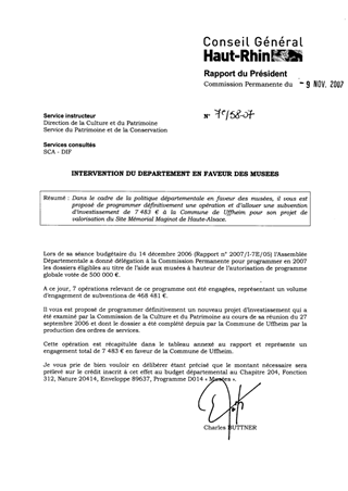 Dans le cadre de la politique départementale en faveur des musées, il vous est proposé de programmer définitivement une opération et d’allouer une subvention d’investissement de 7 483 € à la Commune de Uffheim pour son projet de valorisation du Site Mémorial Maginot de Haute-Alsace.