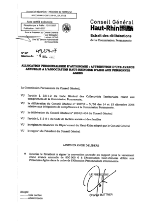 Allocation personnalisée d'autonomie : attribution d'une avance annuelle à l'association haut-rhinoise d'aide aux personnes âgées