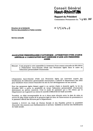 Il est proposé à votre assemblée le versement d’une avance annuelle de 850 000 € à l’Association haut-rhinoise d’Aide aux Personnes Agées dans le cadre de l’allocation personnalisée d’autonomie.