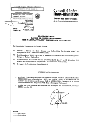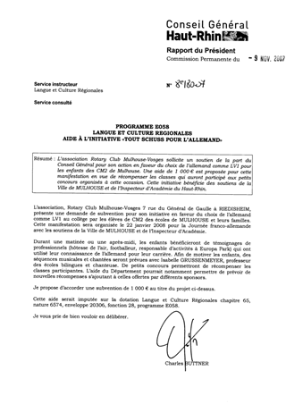 L’association Rotary Club Mulhouse-Vosges sollicite un soutien de la part du Conseil Général pour son action en faveur du choix de l’allemand comme LV1 pour les enfants des CM2 de Mulhouse. Une aide de 1 000 € est proposée pour cette manifestation en vue de récompenser les classes qui auront participé aux petits concours organisés à cette occasion. Cette initiative bénéficie des soutiens de la Ville de MULHOUSE et de l’Inspecteur d’Académie du Haut-Rhin.