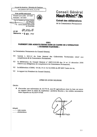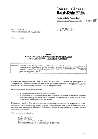 Dans le cadre de l’opération « jachères fleuries », le Conseil Général a décidé de soutenir les 84 agriculteurs qui ont contribué à rendre le paysage haut-rhinois plus agréable. Il vous est proposé d’apporter une aide d’un montant total de 16.773 € pour une surface 55,91 ha.