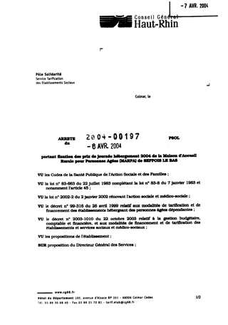 portant fixation des prix de journée hébergement 2004 de la Maison d'Accueil Rurale pour Personnes Agées (MARPA) de SEPPOIS LE BAS Resumé Pièces jointes ARRETE Assemblée : Non défini Date : 06/04/2004 Rapporteur : Non défini Collectivité : Conseil départemental du Haut-Rhin Direction : Non défini Service : Service de la Tarification des Etablissements Domaine : Prix de Journée Commission :
