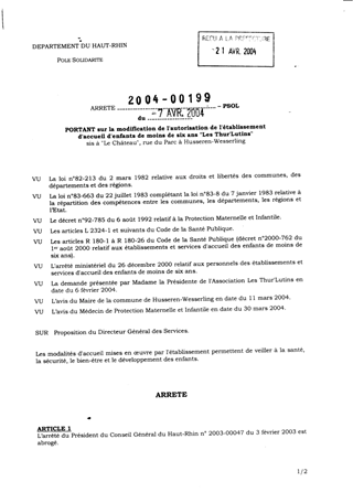 Portant sur la modification de l'autorisation de l'établissement d'accueil d'enfants de moins de six ans "Les Thur'Lutins" sis à "Le Château", rue du parc à Husseren-Wesserling Resumé Pièces jointes ARRETE Assemblée : Non défini Date : 07/04/2004 Rapporteur : Non défini Collectivité : Conseil départemental du Haut-Rhin Direction : Non défini Service : Direction de la Solidarité Domaine : Accueil d'enfants Commission :