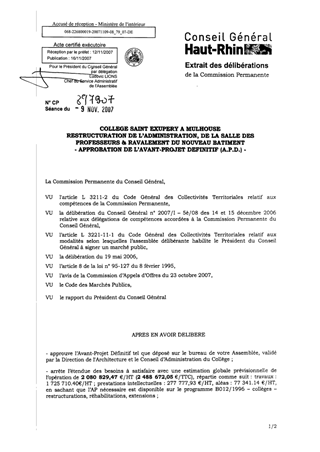 Collège ST Exupéry à Mulhouse. Restructuration de l'administration, de la salle des professeurs et ravalement du nouveau bâtiment. Approbation de l'avant projet définitif (APD)