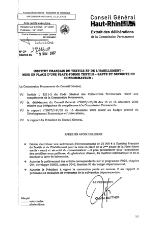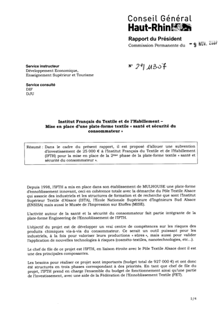 Dans le cadre du présent rapport, il est proposé d’allouer une subvention d’investissement de 25 000 € à l’Institut Français du Textile et de l’Habillement (IFTH) pour la mise en place de la 2ème phase de la plate-forme textile « santé et sécurité du consommateur ».