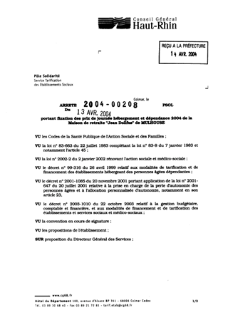 Poartant fixation des prix de journée hébergement et dépendance 2004 de la Maison de retrite "Jean Dollfus" de MULOUSE Resumé Pièces jointes ARRETE Assemblée : Non défini Date : 13/04/2004 Rapporteur : Non défini Collectivité : Conseil départemental du Haut-Rhin Direction : Non défini Service : Service de la Tarification des Etablissements Domaine : Prix de Journée Commission :