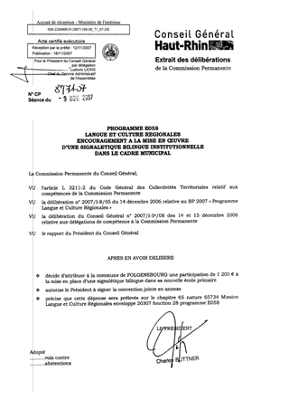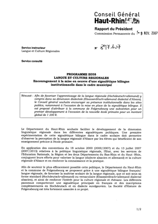 Afin de favoriser l’apprentissage de la langue régionale (Hochdeutsch=allemand) y compris dans sa dimension dialectale (Elsasserditsch=allemand dialectal d’Alsace), le Conseil général souhaite encourager sa présence institutionnelle dans les sites publics, notamment à l’occasion de la mise en place de la signalétique bilingue. Il est proposé d'attribuer à la commune de Folgensbourg une subvention pour un premier développement à l’occasion de la nouvelle école primaire pour un montant global de 1 200 €.