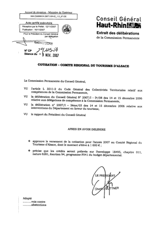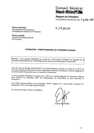 Il est proposé d’attribuer la somme de 1 600 € qui correspond au montant de la cotisation demandée par le Comité Régional du Tourisme d’Alsace pour l’année 2007.