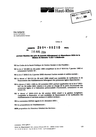 Portant fixation des prix de journée hébergement et dépendance 20004 de la Maison de Retraite "l'Arc" à MULHOUSE Resumé Pièces jointes ARRETE Assemblée : Non défini Date : 16/04/2004 Rapporteur : Non défini Collectivité : Conseil départemental du Haut-Rhin Direction : Non défini Service : Service de la Tarification des Etablissements Domaine : Prix de Journée Commission :