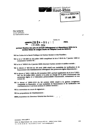 Portant fixation des prix de journée hébergement et dépendance 2004 de la section Soins de Longue Durée de l'Hôpital Local de SOULTZ Resumé Pièces jointes ARRETE Assemblée : Non défini Date : 16/04/2004 Rapporteur : Non défini Collectivité : Conseil départemental du Haut-Rhin Direction : Non défini Service : Service de la Tarification des Etablissements Domaine : Prix de Journée Commission :