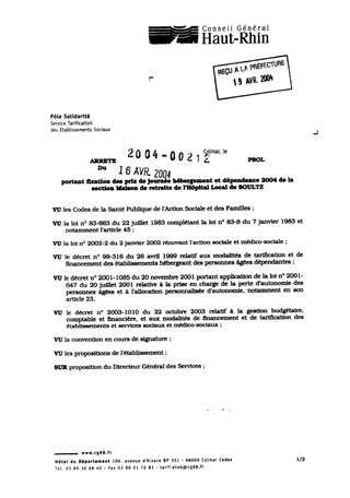 Portant fixation des prix de journée hébergement et dépendance 2004 de la section de Maison de retraite de l'Hôpital Local de SOULTZ Resumé Pièces jointes ARRETE Assemblée : Non défini Date : 16/04/2004 Rapporteur : Non défini Collectivité : Conseil départemental du Haut-Rhin Direction : Non défini Service : Service de la Tarification des Etablissements Domaine : Prix de Journée Commission :
