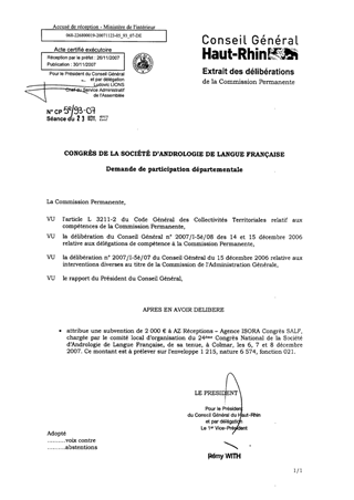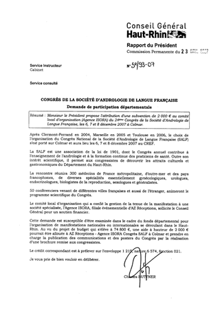 Monsieur le Président propose l'attribution d'une subvention de 2 000 € au comité local d’organisation (Agence ISORA) du 24ème Congrès de la Société d’Andrologie de Langue Française, les 6, 7 et 8 décembre 2007 à Colmar