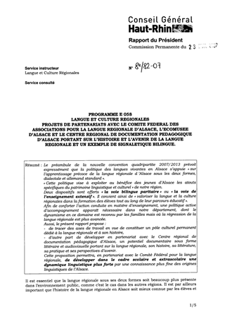 Le préambule de la nouvelle convention quadripartite 2007/2013 prévoit expressément que la politique des langues vivantes en Alsace s’appuie « sur l’apprentissage précoce de la langue régionale d ’Alsace sous les deux formes, dialectale et allemand standard ». « Cette politique vise à exploiter au bénéfice des jeunes d’Alsace les atouts spécifiques du patrimoine linguistique et culturel » de notre région. Deux dispositifs sont offerts « la voie bilingue paritaire » ou « la voie de l’enseignement extensif ». Il convient ainsi de « valoriser la langue et la culture régionales dans la formation des élèves tout au long de leur parcours éducatif ». Afin de conforter l’action conduite en matière d’enseignement, une politique active d’accompagnement apparaît nécessaire dans notre département, dont le dynamisme en ce domaine est reconnu par les familles mais où la régression de la langue régionale est plus avancée. Aussi, le présent rapport propose : - de tracer des axes de travail en vue de constituer un pôle culturel permanent dédié à la langue régionale et à son histoire, - d’autre part de développer en partenariat avec le Centre régional de documentation pédagogique d’Alsace, un potentiel documentaire sous forme littéraire et audiovisuelle portant sur la langue régionale, son histoire, sa littérature, sa pratique et ses perspectives d’avenir. Cette proposition permettra, en partenariat avec le Comité Fédéral pour la langue régionale, de développer dans le cadre scolaire et extrascolaire une dynamique linguistique plus forte par une connaissance plus fine des origines linguistiques de l’Alsace.