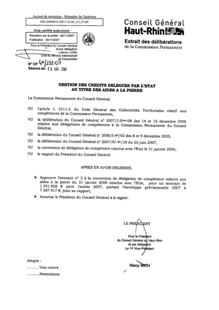Suite à la signature le 31 janvier 2006 avec l’Etat de la convention de délégation de compétence relative aux aides à la pierre, le présent rapport a pour objet d’approuver l’avenant n° 3 relatif à une dotation complémentaire pour 2007 au titre, d’une part de la loi droit opposable au logement, et d’autre part de l’affectation de crédits supplémentaires sur la réserve non affectée.