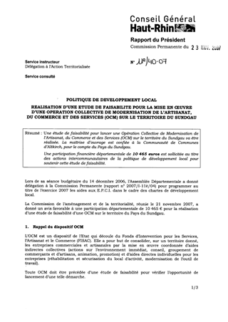 Une étude de faisabilité pour lancer une Opération Collective de Modernisation de l’Artisanat, du Commerce et des Services (OCM) sur le territoire du Sundgau va être réalisée. La maîtrise d’ouvrage est confiée à la Communauté de Communes d’Altkirch, pour le compte du Pays du Sundgau. Une participation financière départementale de 10 465 euros est sollicitée au titre des actions intercommunautaires de la politique de développement local pour soutenir cette étude de faisabilité.