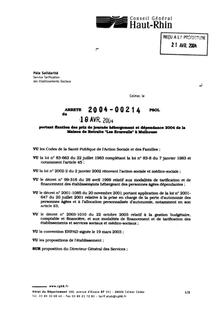 portant fixation des prix de journée hébergement et dépendance 2004 de la Maison de retraite "Les Ecureuils" à MULHOUSE Resumé Pièces jointes ARRETE Assemblée : Non défini Date : 19/04/2004 Rapporteur : Non défini Collectivité : Conseil départemental du Haut-Rhin Direction : Non défini Service : Service de la Tarification des Etablissements Domaine : Prix de Journée Commission :