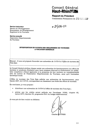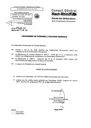 : Il vous est proposé d’accorder une subvention de 3 670 € à l’Office de tourisme des Trois Epis.