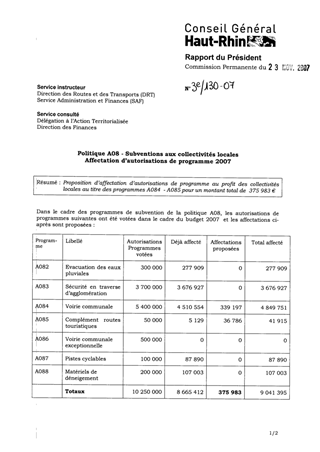 Politique A08. Subventions aux collectivités locales. Affectation d'autorisations de programme 2007