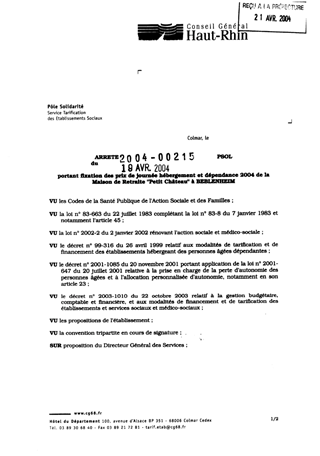 Portant fixation des prix de journée hébergement et dépendance 2004 de la Maison de Retraite "Petit Château" à BEBLENHEIM Resumé Pièces jointes ARRETE Assemblée : Non défini Date : 19/04/2004 Rapporteur : Non défini Collectivité : Conseil départemental du Haut-Rhin Direction : Non défini Service : Service de la Tarification des Etablissements Domaine : Prix de Journée Commission :