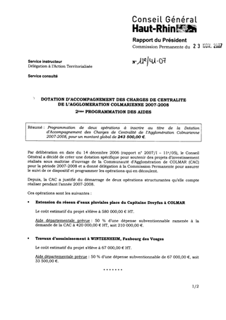 Programmation de deux opérations à inscrire au titre de la Dotation d’Accompagnement des Charges de Centralité de l’Agglomération Colmarienne 2007-2008, pour un montant global de 243 500,00 €.