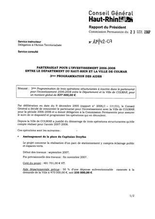 3ème Programmation de trois opérations structurantes à inscrire dans le partenariat pour l’investissement 2006-2008 entre le Département et la Ville de COLMAR, pour un montant global de 537 000,00 €.