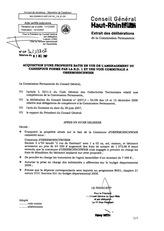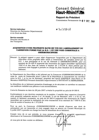 le présent rapport a pour objet d'approuver l'acquisition par le Département du Haut-Rhin d'une propriété bâtie située à l'intersection du carrefour formé par la R.D. 1 (rue principale) et la rue de Hattstatt à OBERMORSCHWIHR, pour un montant de 64 000 € augmenté des honoraires de l'agent immobilier représentant 7000 € et des frais de notaire à hauteur de 1 373,96 €, étant précisé que la commune s'est engagée à prendre en charge les frais résultant de la démolition du bâtiment.