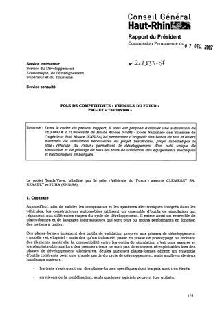 Dans le cadre du présent rapport, il vous est proposé d’allouer une subvention de 163 000 € à l’Université de Haute Alsace (UHA) - Ecole Nationale des Sciences de l’Ingénieur Sud Alsace (ENSISA) lui permettant d’acquérir des bancs de test et divers matériels de simulation nécessaires au projet TestInView, projet labellisé par le pôle « Véhicule du Futur » permettant le développement d’un outil unique de simulation et de pilotage de tous les tests de validation des équipements électriques et électroniques embarqués.