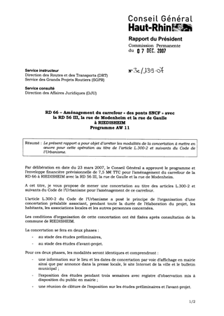 RD 66 - Aménagement du carrefour "des ponts SNCF" avec la RD 56 III, la rue de Modenheim et la rue de Gaulle à RIEDISHEIM- Programme AW 11.