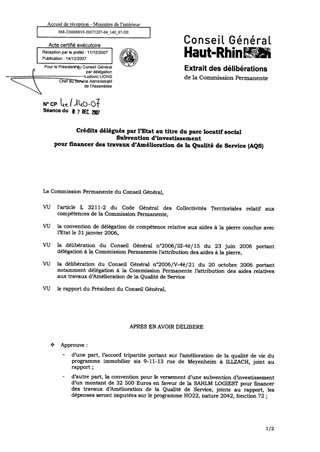 Crédits délégués par l'Etat au titre du parc locatif social. Subvention d'investissement pour financer des travaux d'amélioration de la qualité de service (AQS) (LOGIEST ILLZACH.