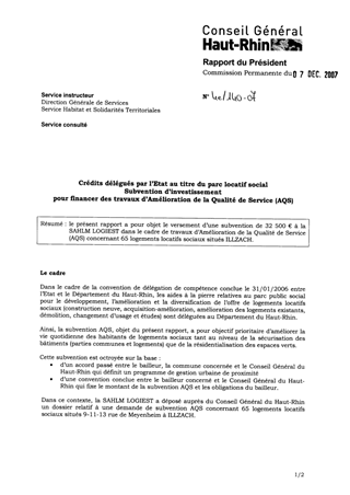le présent rapport a pour objet le versement d’une subvention de 32 500 € à la SAHLM LOGIEST dans le cadre de travaux d’Amélioration de la Qualité de Service (AQS) concernant 65 logements locatifs sociaux situés ILLZACH.