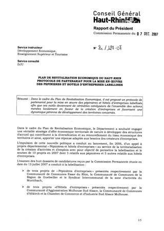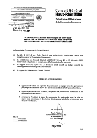 Plan de revitalisation économique du Haut-Rhin. Protocole de partenariat pour la mise en œuvre des pépinières et hôtels d'entreprises labellisés.