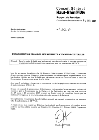 Dans le cadre de l’aide aux bâtiments à vocation culturelle, il vous est proposé de programmer définitivement trois opérations pour un montant de 85 776 €.