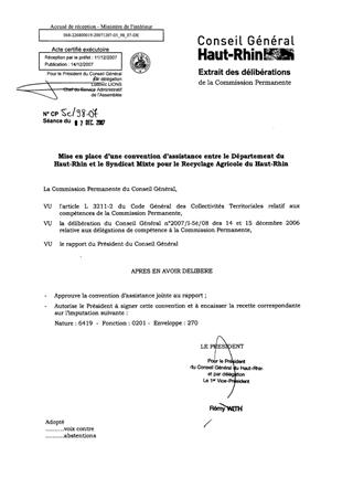 Mise en place d'une convention d'assistance entre le Département du Haut-Rhin et le Syndicat Mixte pour le Recyclage Agricole du Haut-Rhin.
