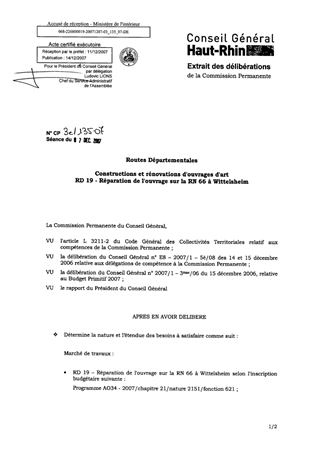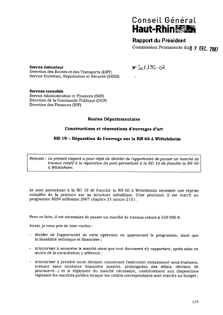 Le présent rapport a pour objet de décider de l'opportunité de passer un marché de travaux relatif à la réparation du pont permettant à la RD 19 de franchir la RN 66 à Wittelsheim.