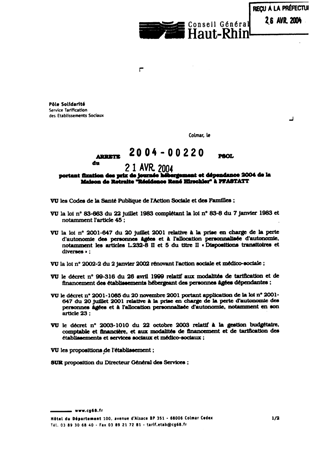 Portant fixation des prix de journée hébergement et dépendance 2004 de la Maison de Retraite "Résidence René Hirschler" à PFASTATT Resumé Pièces jointes ARRETE Assemblée : Non défini Date : 21/04/2004 Rapporteur : Non défini Collectivité : Conseil départemental du Haut-Rhin Direction : Non défini Service : Service de la Tarification des Etablissements Domaine : Prix de Journée Commission :