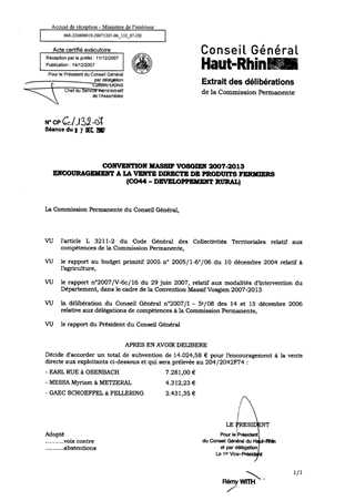 Lors du BP 2007, l’Assemblée Départementale a souhaité poursuivre son soutien à l’agriculture de montagne à travers une convention spécifique entre les trois collectivités alsaciennes, l’Etat n’affichant plus de crédits en ce sens. Dans ce cadre, il vous est proposé de vous prononcer sur trois dossiers représentant 14.024,58 € de subvention.