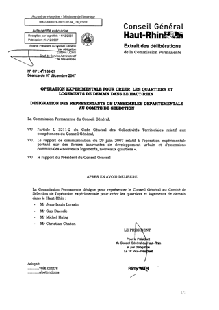 Opération expérimentale pour créer les quartiers et logements de demain dans le Haut-Rhin. Désignation de représentants de l'assemblée départementale au comité de sélection.