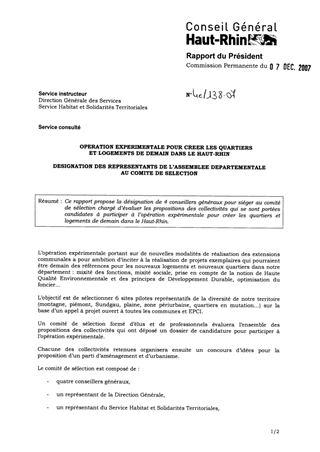 Ce rapport propose la désignation de 4 conseillers généraux pour siéger au comité de sélection chargé d’évaluer les propositions des collectivités qui se sont portées candidates à participer à l’opération expérimentale pour créer les quartiers et logements de demain dans le Haut-Rhin.