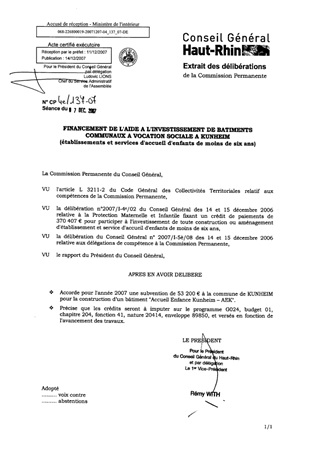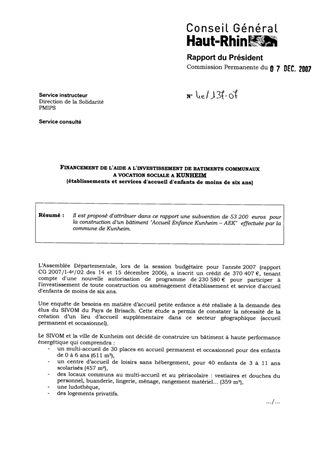 Il est proposé d'attribuer dans ce rapport une subvention de 53 200 euros pour la construction d’un bâtiment "Accueil Enfance Kunheim – AEK" effectuée par la commune de Kunheim.
